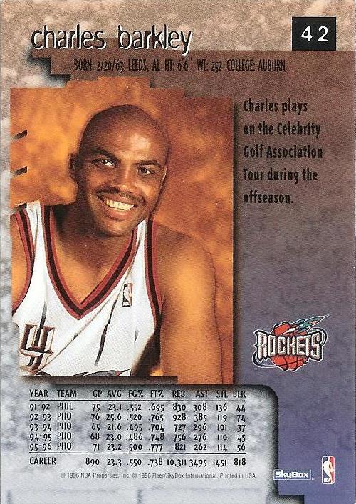 Last week I was going through some cards in my collection and came across this Charles Barkley from 1996-97 Skybox. His pose on the front of the card reminded me of his Right Guard commercial days. If you haven’t seen these, or if it’s been awhile, I’ve included it below: