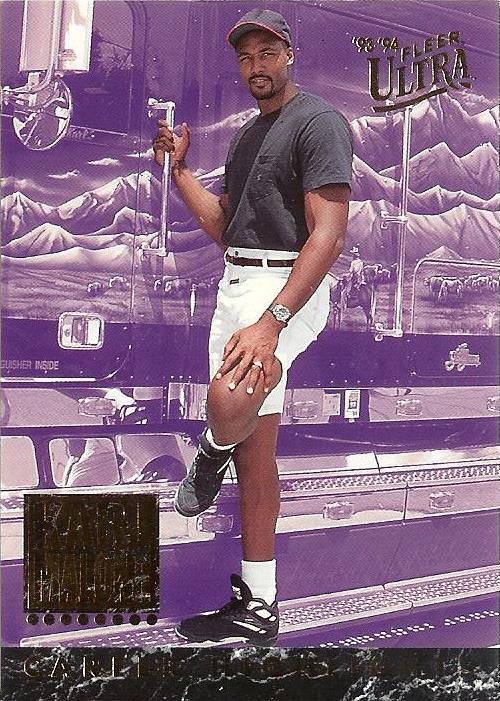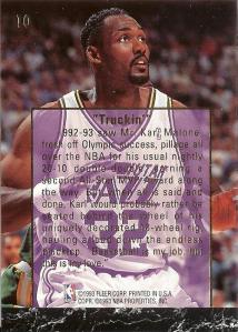1993-94 Ultra features an insert set devoted to Karl Malone’s career highlights. Card #10 displays Karl’s true love, being on the open road, ‘hauling a load down the endless blacktop’. Notice the one-of-a-kind mountainous backdrop on his 18-wheeler, as well as his proper pose. An old New York Times article recounts Karl’s offering his buddy Charles Barkley the chance to observe truck operation from the passenger side. His response was, “I can’t fit my big butt in there.” Trying to cram his ginormous posterior into Karl’s cab would be, as Charles would say, ‘uncivilized’. Malone got out of the trucking business in 1994, but not before this humorous card was printed.