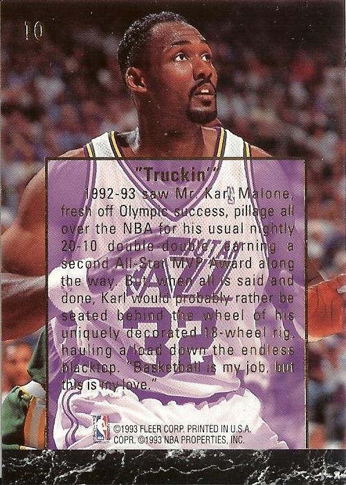 1993-94 Ultra features an insert set devoted to Karl Malone’s career highlights. Card #10 displays Karl’s true love, being on the open road, ‘hauling a load down the endless blacktop’. Notice the one-of-a-kind mountainous backdrop on his 18-wheeler, as well as his proper pose. An old New York Times article recounts Karl’s offering his buddy…