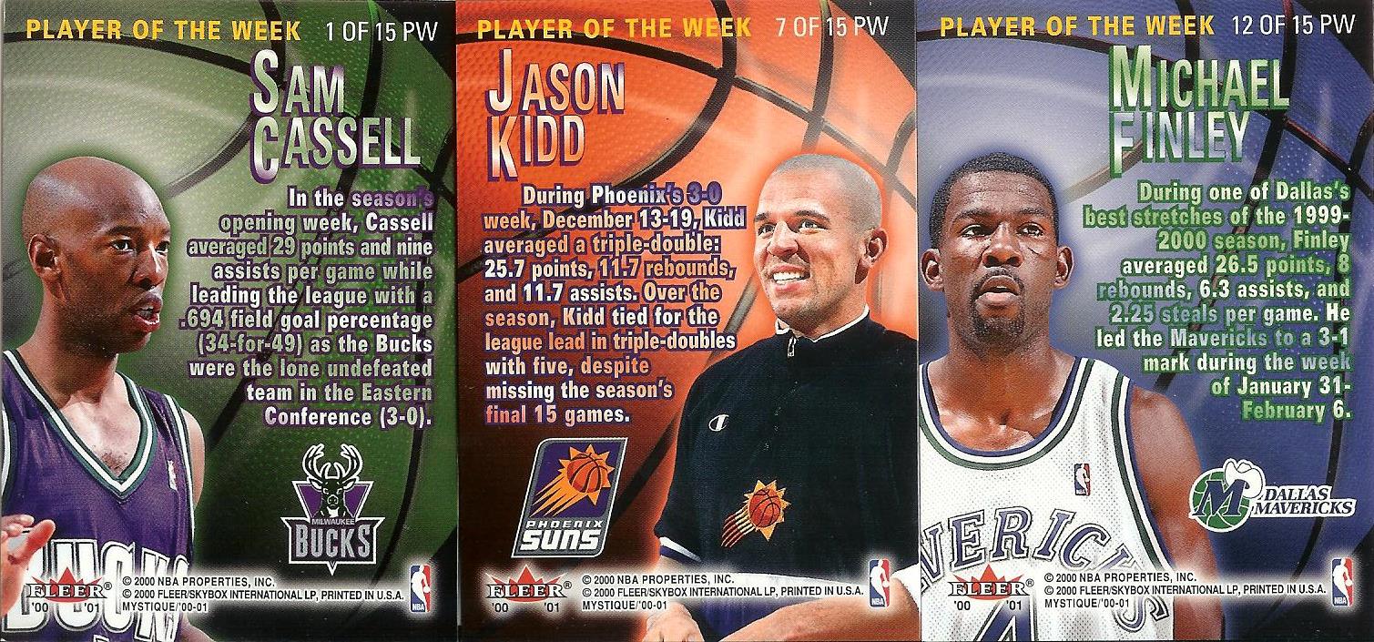 Player of the Week featured 15 players who won the weekly award during the 1999-00 season. The numbers and text on the front of the card are positioned to look like a calendar. The back of the cards highlight the games that led to the player winning the award. Fun to look back at a snapshot of that particular season, the first championship season of a Laker 3-peat.