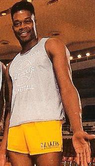 Nothing exceptional about the front of the card. On the card back, though, Smooth and James Worthy show off shorts they probably wore in their childhood.
