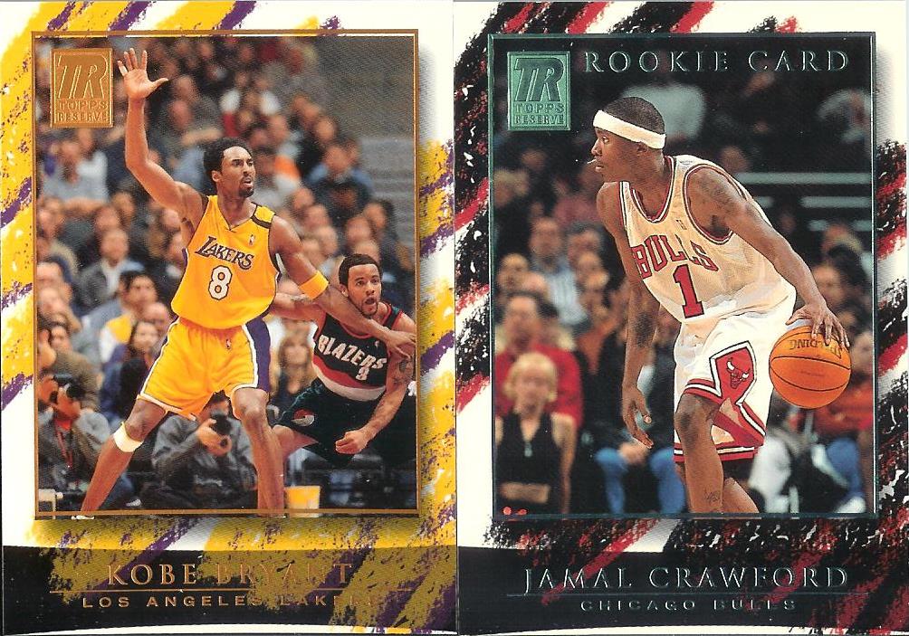 A unique set in several ways. This was the only basketball set from Topps released under the ‘Reserve’ name, evolving from the ‘Gallery’ brand. The card fronts have paint splotches to make up the card borders, with a game action shot centered to create the appearance of a canvas. The card backs have some stats not typically included, showing how the player performed on various days rest (0,1,2,3+), in addition to season averages. It was a bit disappointing to open any duplicates at all considering we opened less than half the base set, but could have been worse.