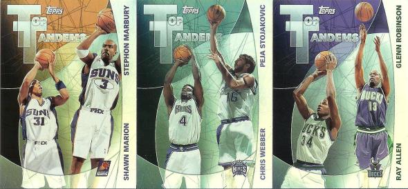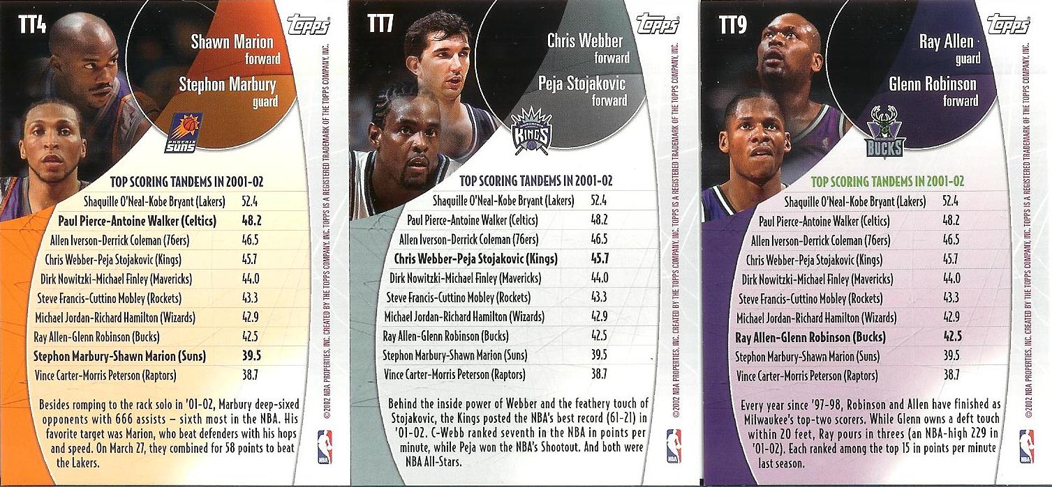 Some of my favorite scoring duos from the late 90s-early 2000s are featured here, such as Big Dog and Ray Allen, Paul Pierce and Antoine Walker, the Rockets backcourt of Francis and Mobley. The back of each card lists the top 10 scoring Duo’s from the previous season, serving as a checklist for the remaining cards. I did notice a minor error on the Marbury/Marion card. Typically only the players on the front of the card appear in bold on the back. The Marbury/Marion also has Pierce and Walker in bold. Minor, but something I easily missed the first time.