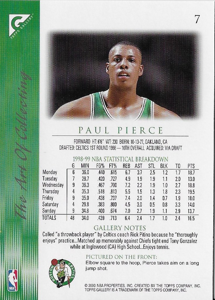 Here’s a quick look at the back of the Pierce. Each back has a column going down the left side with a script that says ‘The Art of Collecting’. The rest of the card breaks down the prior season’s stats in a way you don’t often see. Clearly Paul put in extra work during Thursday shootarounds.