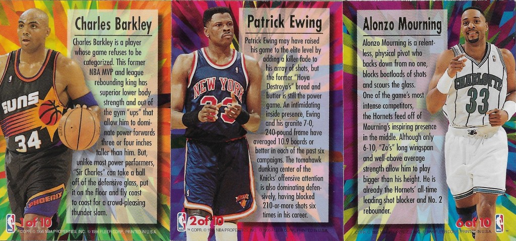 These cards are colorful, they are in your face, just as these big men play the game, with purpose and with power. When I think about 90s big men, the 10 guys in this set are the ones I think of, without question. A few are missing, of course from the end of the decade (Duncan, KG, etc…), but this set gets most of them in one place.
