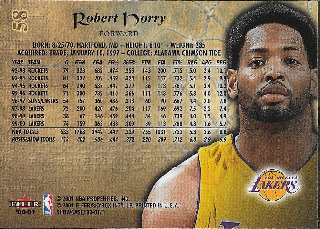 A nice close up on the back here along with a full career of stats for Horry. The net blends well into the background. Again, a simple, classy design.