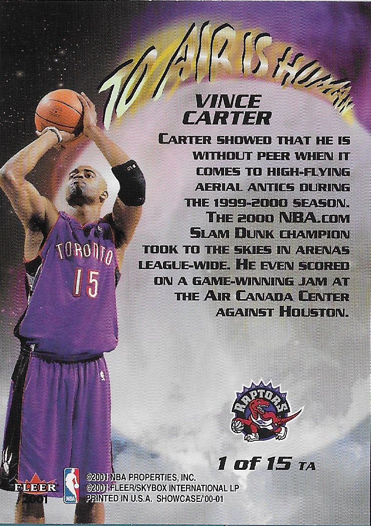 I’ve opened my fair share of Vince Carter inserts over the years, and this To Air is Human is one of my favorites. Has the same finish as the base cards. This design has some subtle details like the basketball in the top left with the shadow of Vince gliding through the air. The colors on the Earth really make this design work.