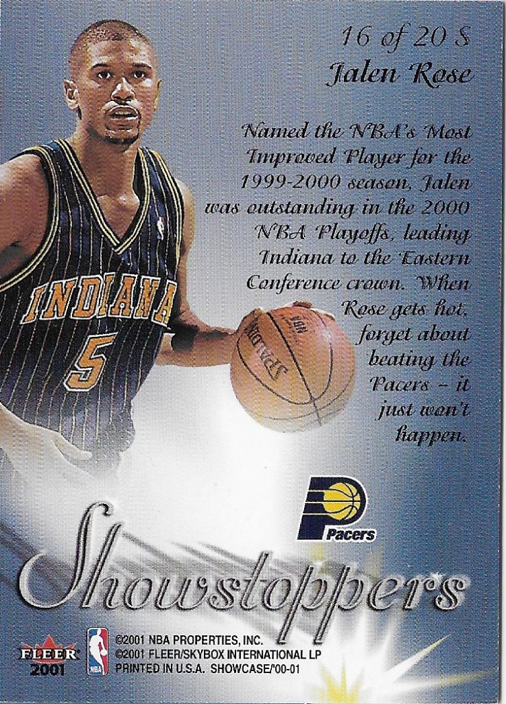 Since I didn’t pull an insert in this pack, I figured I’d share a few of the inserts I do have in my collection. Showstoppers were 1:6 packs. I remember pulling Paul Pierce, Keith Van Horn, the Jalen Rose above, and one other I can’t recall. Rose had a bunch of inserts from both Fleer and Upper Deck in 2000-01, probably because of the NBA Finals run the Pacers were coming off of the previous year. Guess who led that team in scoring? Hint- it wasn’t Reggie.