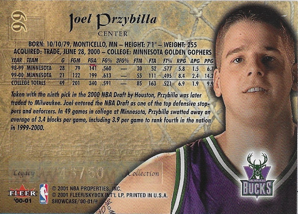 I still have the Legacy Collection pull from my box of Fleer Showcase years ago. The positive, it was a rookie. The negative, it was Joel Przybilla. Not exactly a force in the hobby, but the odds were certainly against pulling a Legacy Collection parallel.
