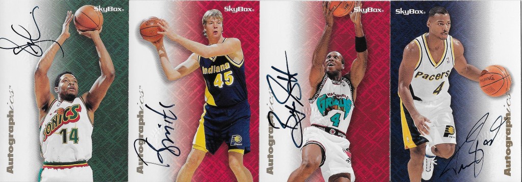 Bonus– While I’m talking about 1996-97 Skybox Premium I thought I’d show the four I have in my Pacers autograph collection. Two of the four are non-Pacers uniforms but I’ll never shy away from a first-year Autographics card. Autographics were 1:72 hobby packs in Series 1 and Series 2, so 1 in every 3 boxes.
