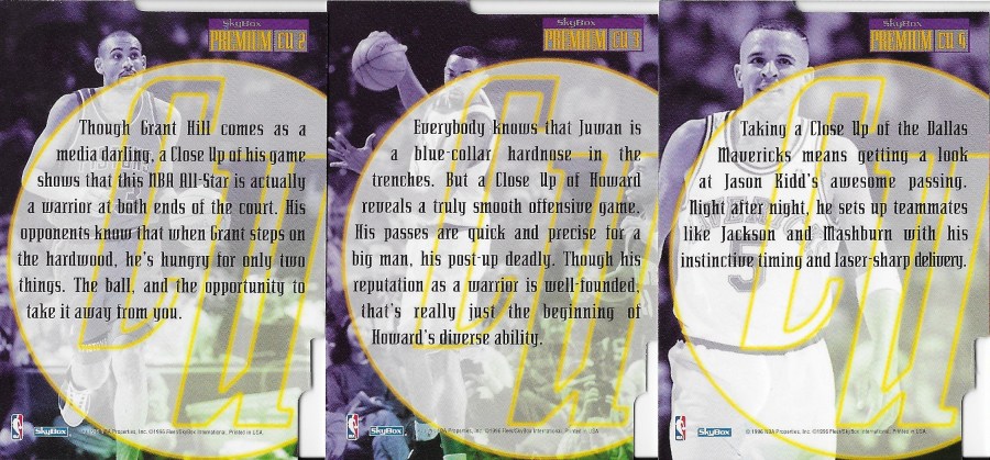 Close-Ups is one of the top inserts from that year’s Skybox Premium set. The theme of it reminds me of the ‘Special Forces’ insert set I wrote about just recently. Close-Ups is about looking into the magnifying glass and seeing what these players bring to the court. What put these guys over the top? In some cases these are obvious (Kidd’s passing ability), and in other cases not so obvious at first glance (Howard’s passing for a big man).