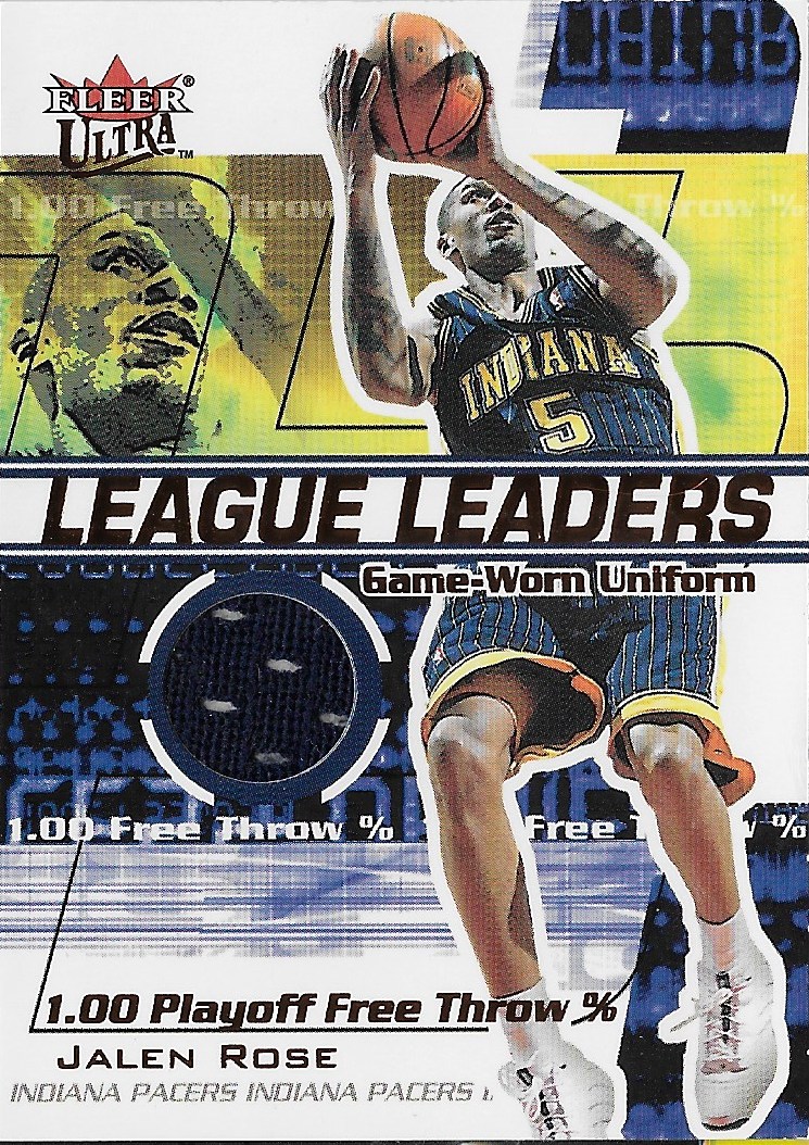 Rose shows up in this League Leaders set from 2001-02 Ultra because of his perfect free-throw percentage in the 2000-01 playoffs, 7 for 7 in the Pacers first round series against Philadelphia. Rose scored 40 points and Reggie Miller hit a game winning 3-pointer at the end of game 1. The Sixers went on to win the next 3 games and ended up going all the way to the NBA Finals. Whatever it took for Rose to end up in this memorabilia set, I’m glad he did! This card is #’d out of 450.