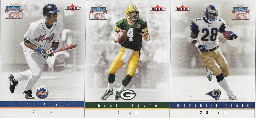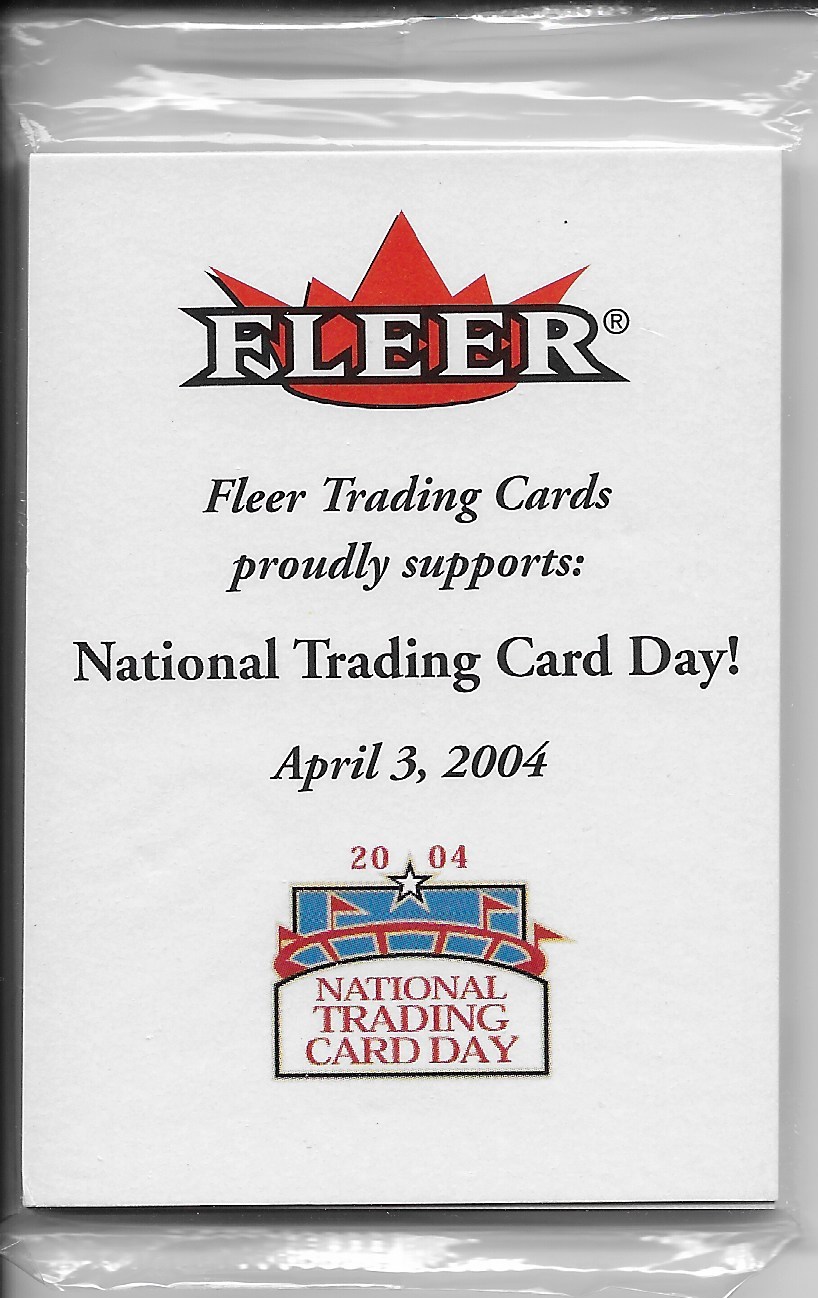 The pack itself is clear, with a top card showing the Fleer logo and the 2004 National Trading Card Day logo. The set itself is 53 cards and includes cards from the 3 major brands: Fleer, Topps, and Upper Deck. The Fleer portion of the set is 9 cards and covers 3 sports.