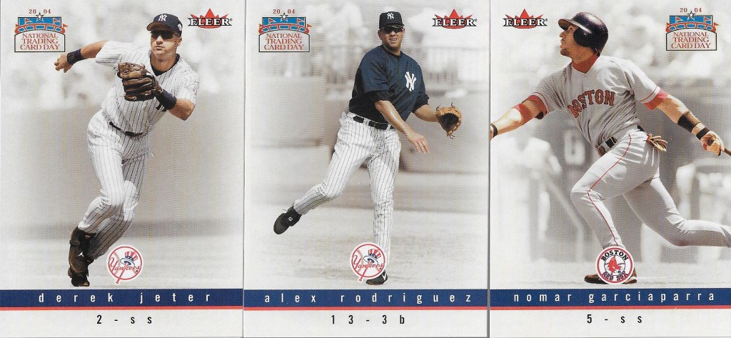 Each card has the National Trading Card Day logo, and has a black and white background with the player in color at the forefront. These three guys were featured players for Fleer back at that time. Carter even had entire insert sets devoted to him early in his career.