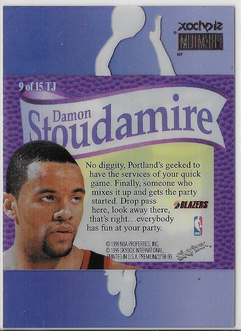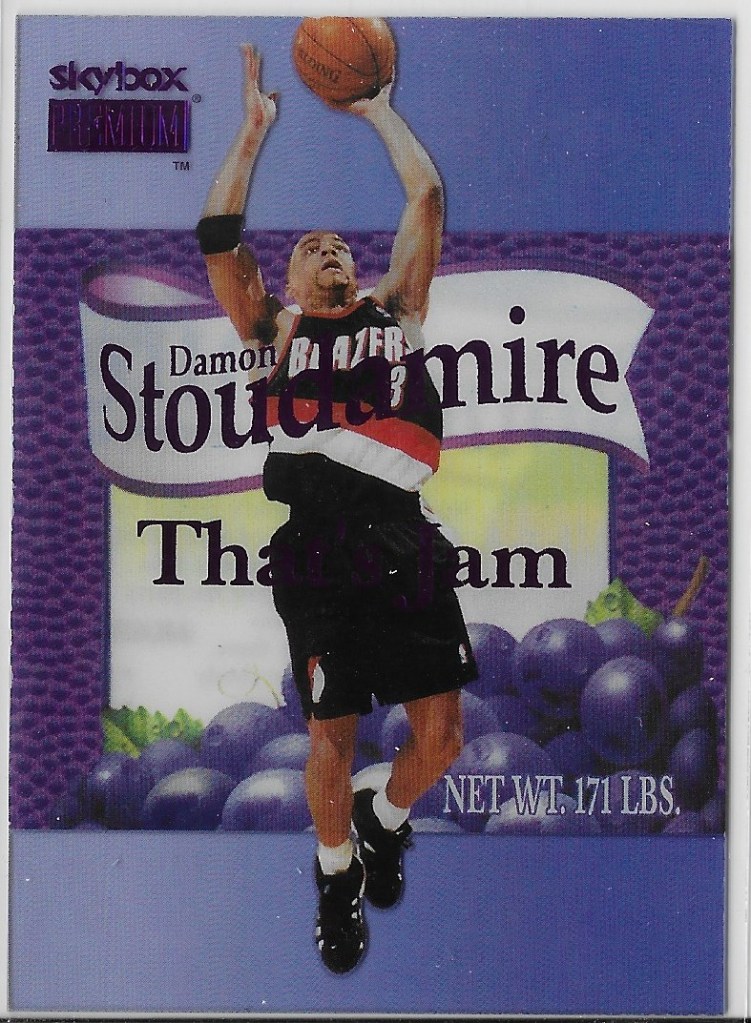 I’ve typed a lot of words so far just to say that I noticed a card show up for a much lower price than I’ve normally seen it, and it’s from the ‘That’s Jam’ insert set from 1998-99 Skybox Premium Series 2. The odds of opening are 1:96 packs, which doesn’t seem too bad looking back, but these cards, especially the top players, are pretty pricey (Kobe obviously being absurdly expensive).