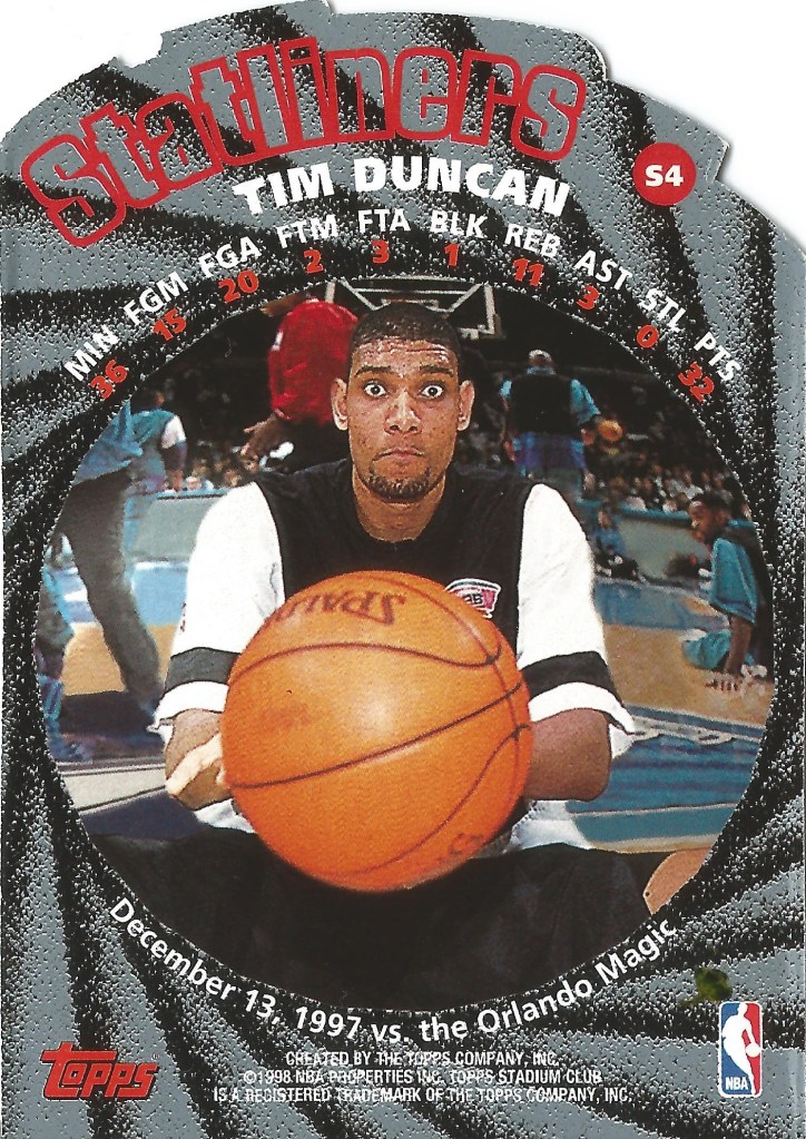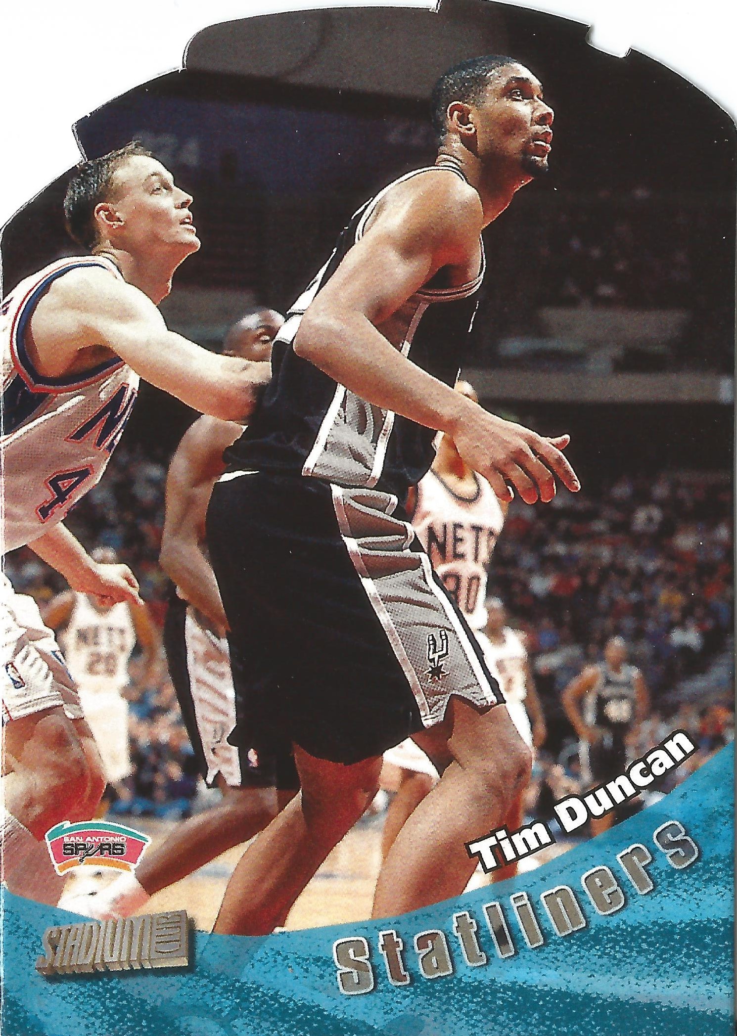 My last card I picked up off of sportlots. If you’re OK with picking up a card without seeing a picture, while probably getting it for an excellent price, sportlots is the place for you. Statliners is a die-cut insert set from 1998-99 Stadium Club, with the odds of pulling in one in eight series one packs. This one appealed to me especially because it’s a matchup of the top two picks from the 1997 NBA Draft.