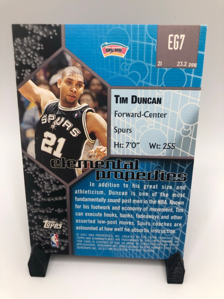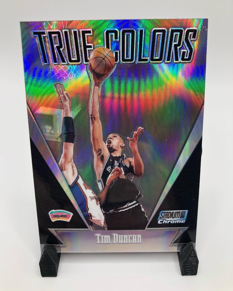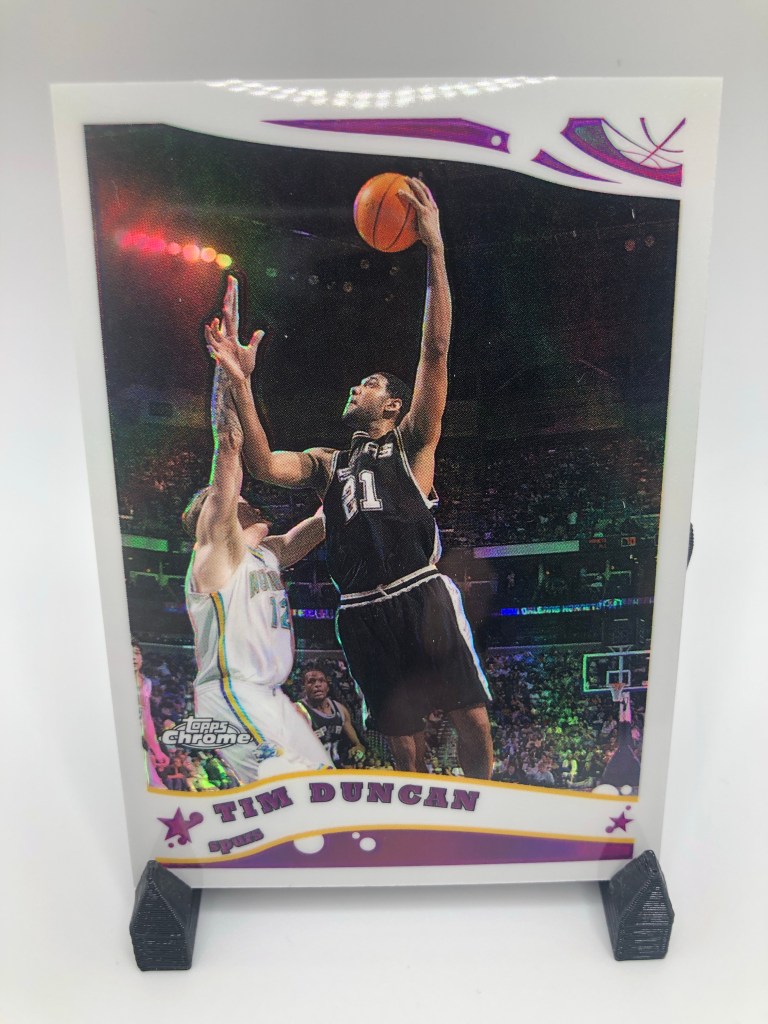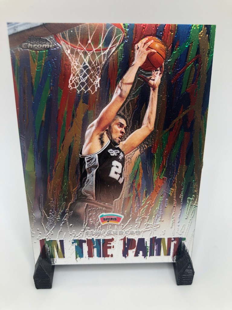 The go-to shiny cards for me, and for a lot of collectors are Topps Chrome refractors. They hold up and the collectability and demand for these cards continue to increase as years go by, especially for the stars. The nostalgia factor is high here. What I like about the Chrome refractors compared to say, Prizm silvers for example, is that more of the background image is shown. The border takes up minimal space on the card. I love seeing Duncan lefty hook over the helpless defender.