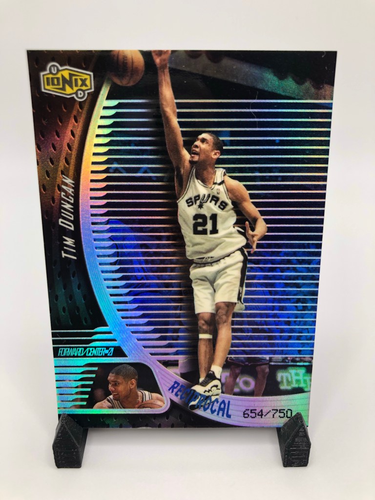 I’ve always wanted to pick up a Reciprocal from 1998-99 Upper Deck Ionix. It’s preferred for me over the 1999-00 version for a couple of reasons. The shine on this parallel obviously adds to the appeal, and the fact that these are serial numbered to 750. The Spurs were meant for this Ionix set, because the team colors complement the design so well. This card hits on multiple elements.