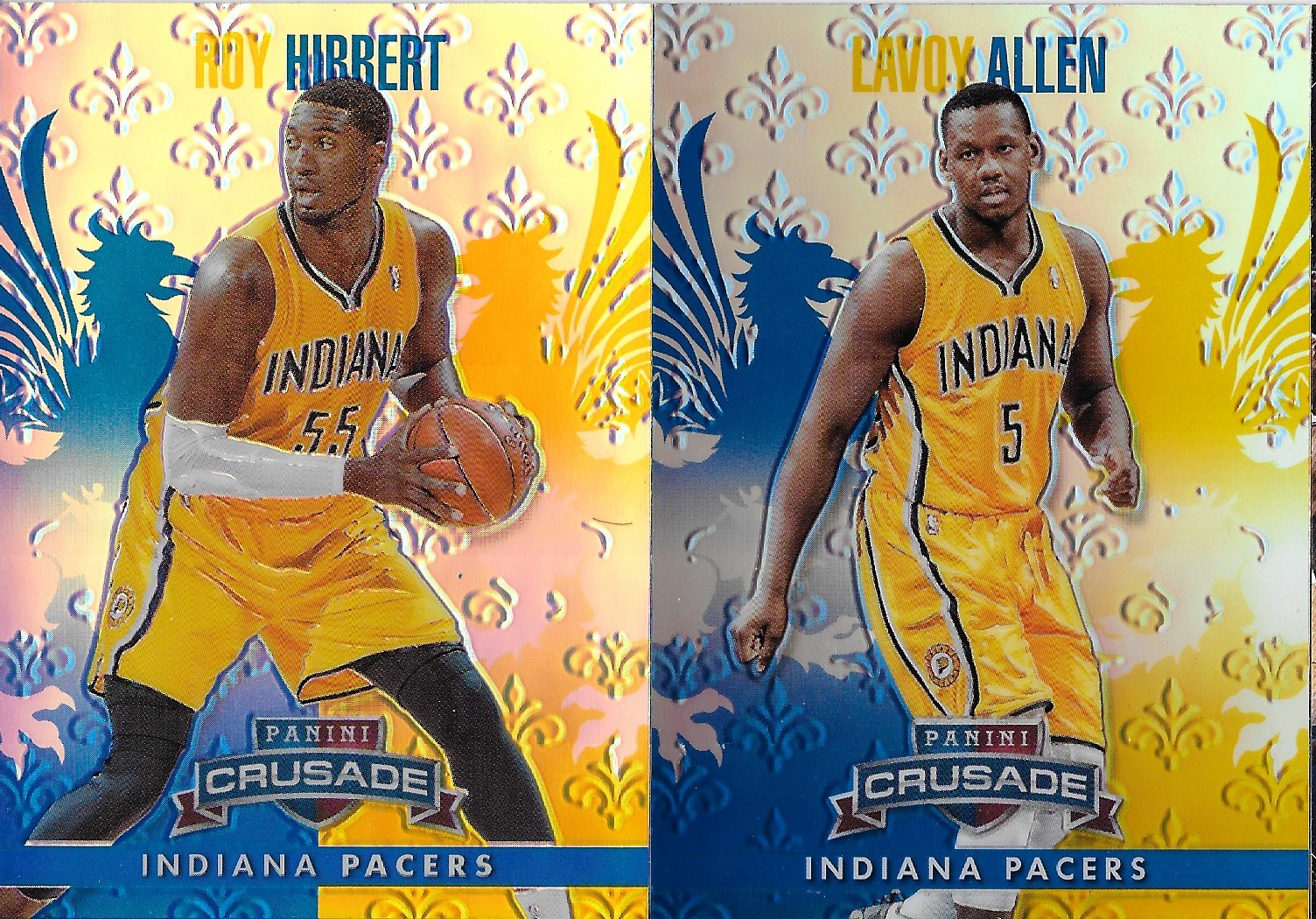 Excalibur and Crusade I’ve been a fan of since the 2016-17 cycle of cards when I opened a loose retail pack of Excalibur on a whim one day. I’d never picked any Crusade cards until a few months ago, and the Pacers uniform of course looks great with the blue parallels. These are from 2013-14.