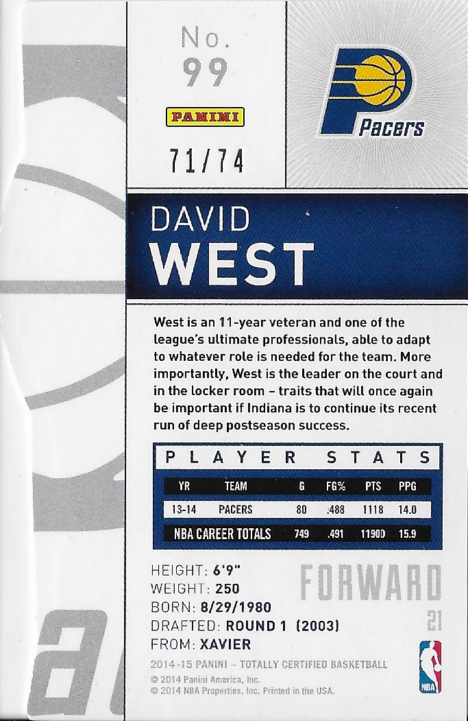 Which brings me to some of my recent collection adds. I’ve seen lots of buzz recently around 2014-15 Totally Certified Mirrors. I collected and even opened a box of Totally Certified from 2010-11, but didn’t open anything from the brand after that. While I’ve seen color mirrors, the blue die-cuts are the ones that stood out to me from a team collecting perspective. Pacers uniforms go well with many blue parallels, and these blue mirrors out of 74 are no exception. The Pacers are all priced pretty reasonably and I’m pleased to have the Paul George, the most difficult to find, and the David West. They’re great looking parallels with a print run of less than 100, and they’re die-cut. What’s not to like? These are right up my alley. And I would have picked them up sooner, but I didn’t know what I didn’t know.