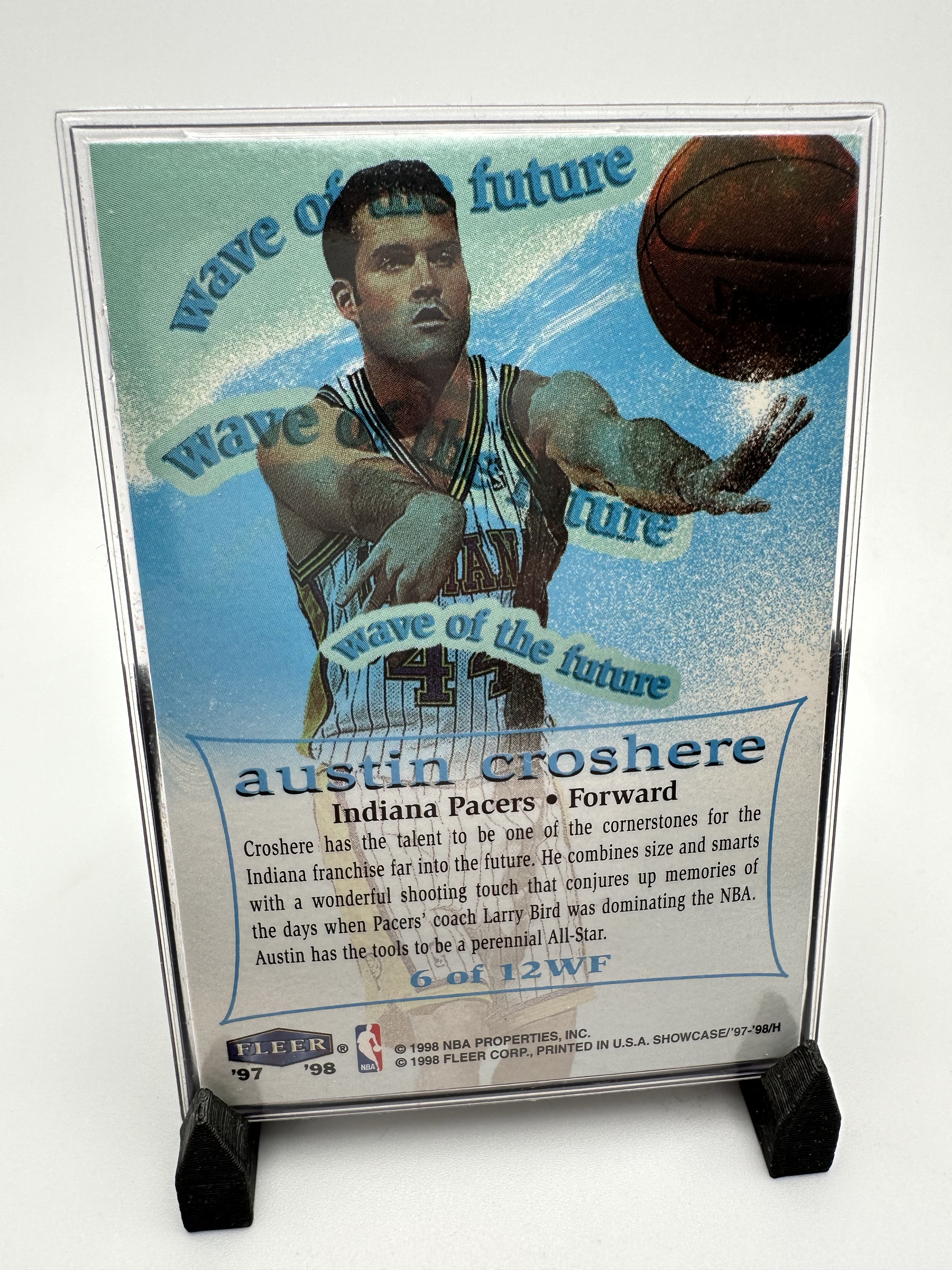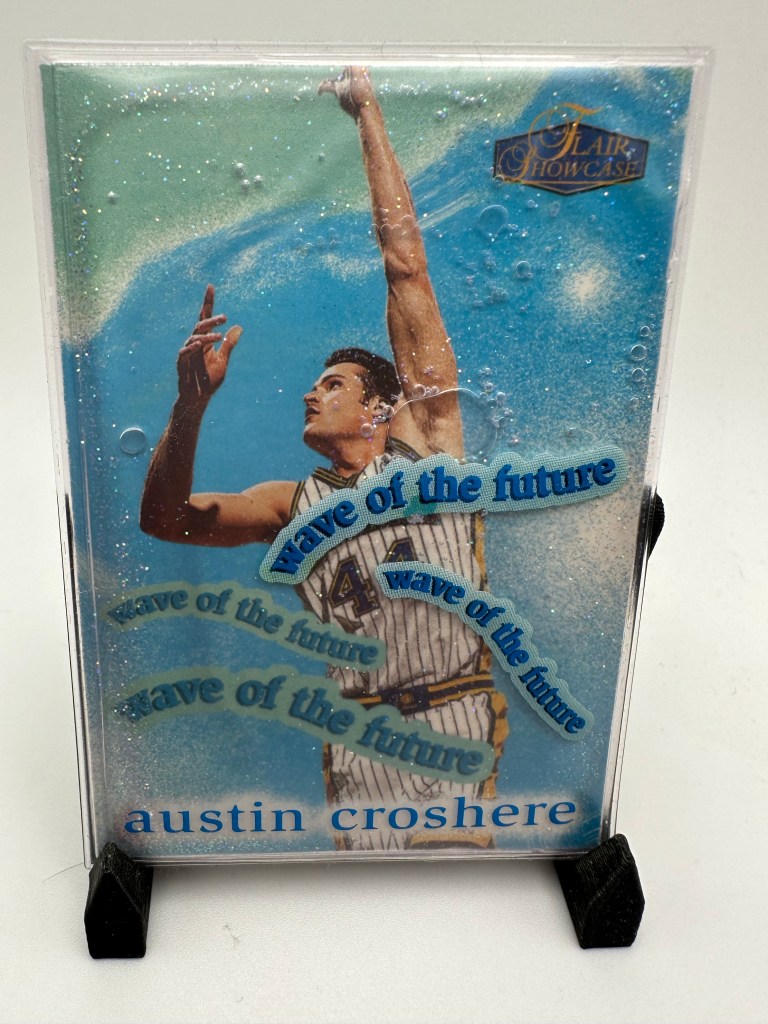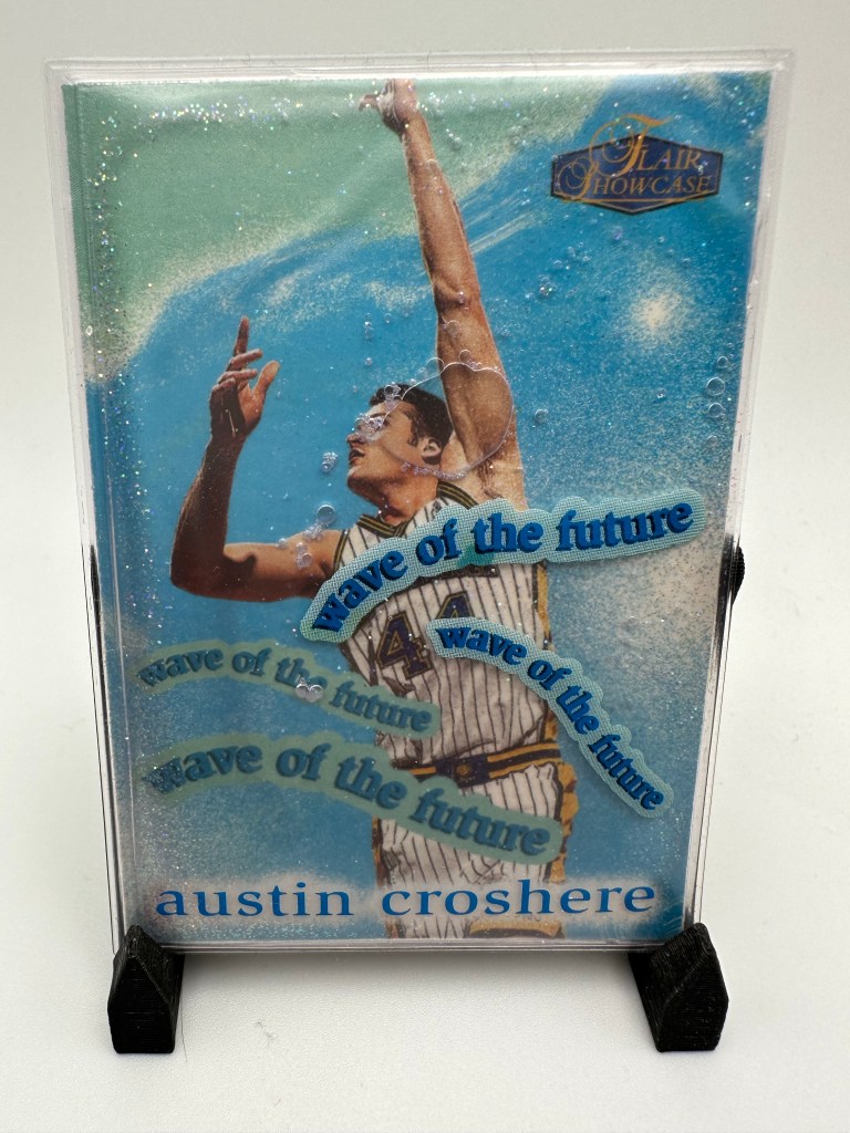 And for the oddest non-oddball on the list, it’s an Austin Croshere insert from 1997-98 Fleer Showcase, and it actually has liquid inside of the card. The dimensions of the card are smaller than a normal card, the surface of the card is squishy, and when you push on the front of the card, the glittery gel actually moves around. It’s in a plastic case so that the gel stays inside. There’s no other card set like this one. What’s just as odd is that while it’s a rookie year set, the best rookies from 1997-98 are not included. No Tim Duncan, no TMac, no Keith Van Horn.