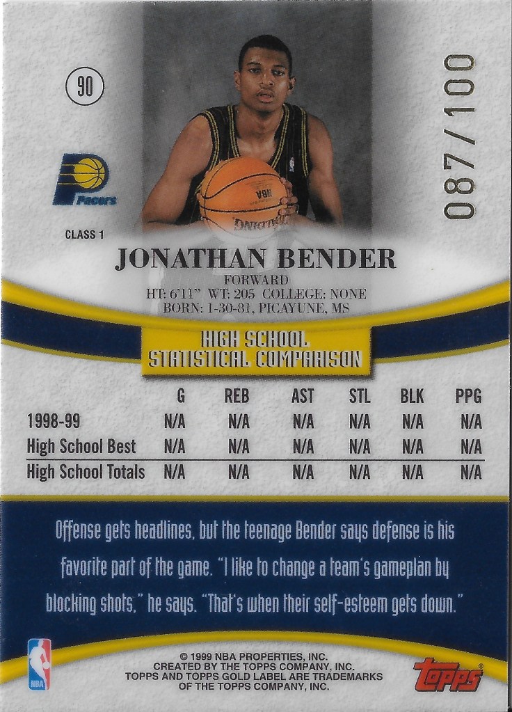 Months ago one eBay seller listed a bunch of 1999-00 Topps Gold Label Red Label parallels up for auction, including a Jonathan Bender. Many of these went for much more than I would expect, including the Bender which was well out of my price range. I expect a combination of set collectors and player collectors bought these up and in the process drove up the price. The Class 2 is out of 50 and Class 3 is out of 25. The Class 1 is out of 100 and in turn is more affordable.