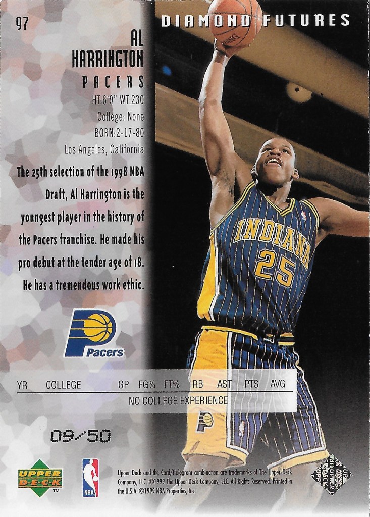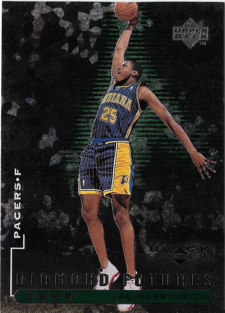 Moving to the 1998-99 season, I picked up a 1998-99 Black Diamond Quadruple Diamond rookie out of 50 of Al Harrington. The veteran cards in the Quad/Green parallel are out of 150, and the rookies are supposed to be out of just 50 copies. I noticed though when looking at adding an Al Harrington that copies exist that are #’d out of 150, as well as 50. It seems like this is an error in the print run. I’ve left space in my Pacers rookie year binder for both copies, but I added the /50 copy first when I saw it for a good price on COMC.