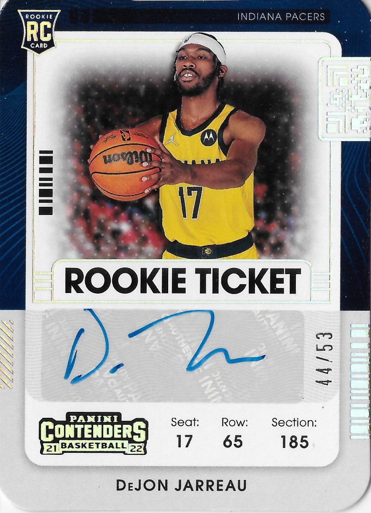 Jarreau is the second player in this post whose only cards in a Pacers uniform are autographed. In this case, it’s 12 different parallels/variations of cards from 2021-22 Panini Contenders. This is the Rookie Season Ticket Stub die-cut parallel out of 53. May as well have a die-cut version if it exists and it’s accessible.