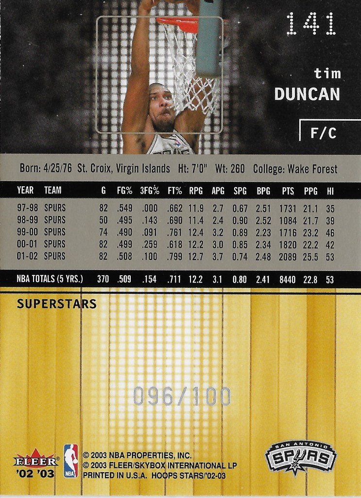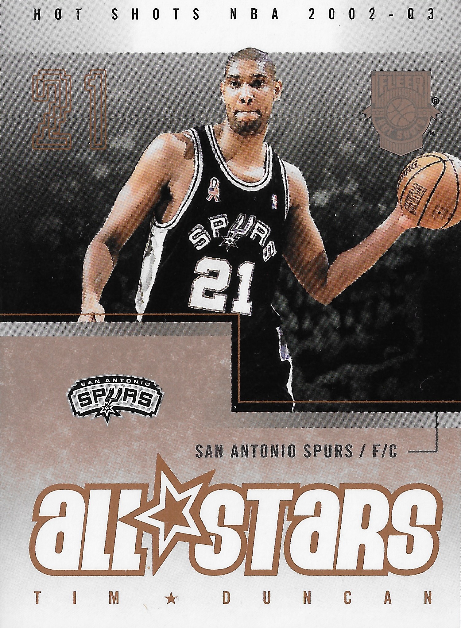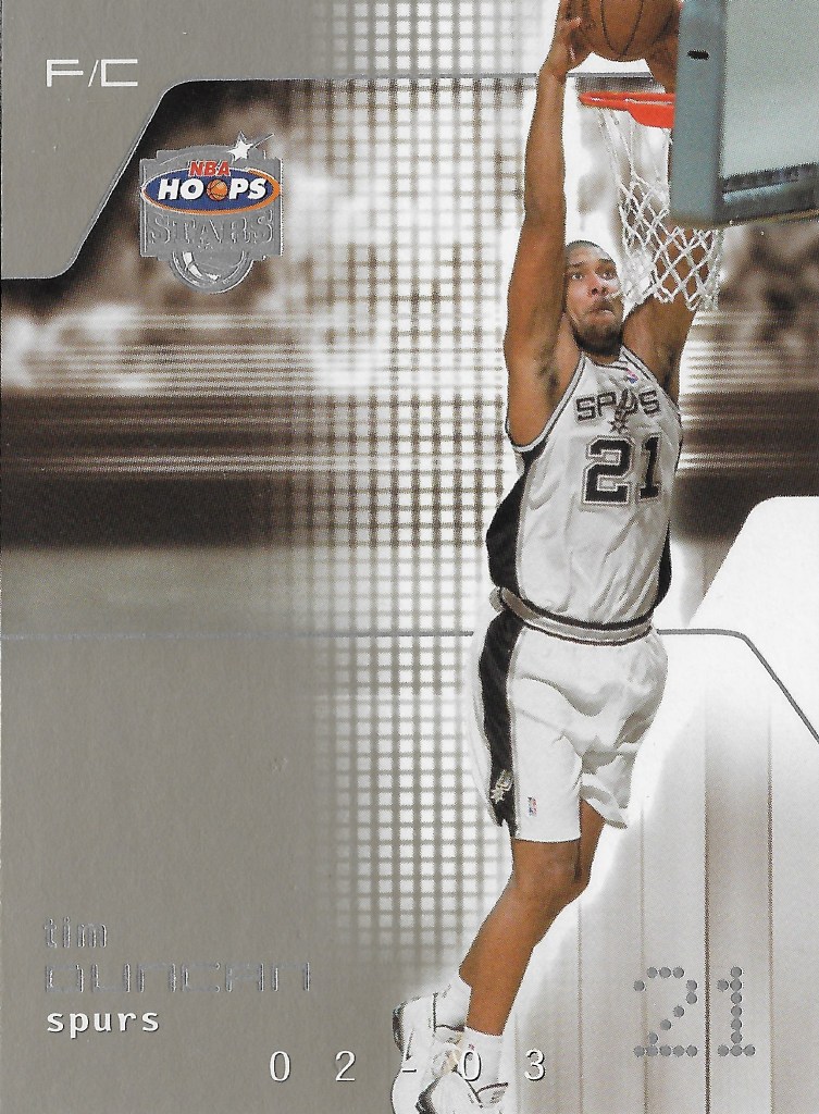 Sticking with 2002-03, I grabbed another Duncan parallel from another ‘one and done’ product, 2002-03 Hoops Stars. Similar to the Hot Hands parallel from the Hot Shot product, Hoops stars has a ‘Five-Star’ parallel, bronze looking as well as compared to the silver base set, numbered out of 299.