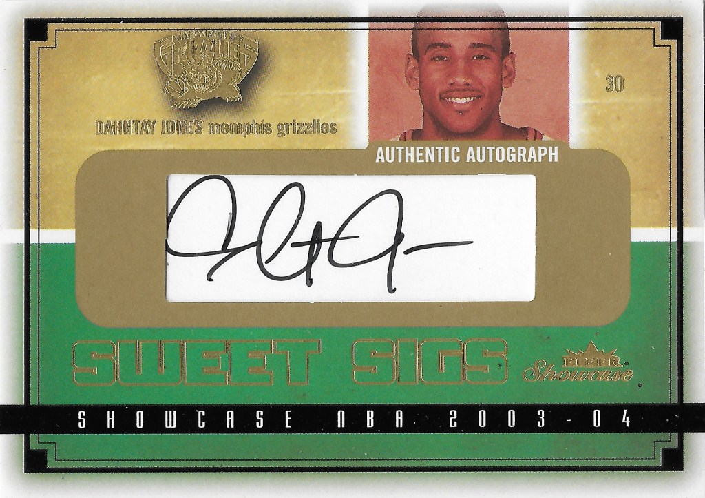 2003-04 is one of my favorite card years, with many quality products, and happens to be Dahntay Jones’ rookie year. The autograph I have comes from 2003-04 Fleer Showcase, a nice looking card that isn’t as obvious as far as it being a card of another team. He isn’t shown in a Memphis jersey, which helps, the logo is in all gold, and the Memphis text is very small. It is a horizontal card which I don’t love for the binder, though.