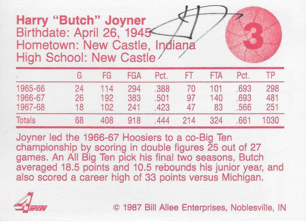 While Joyner played in two games for the ABA Pacers during the 1968-69 season, his only card is a 1986-87 card where he is pictured with Indiana University. Pretty cool card with a black and white photo.