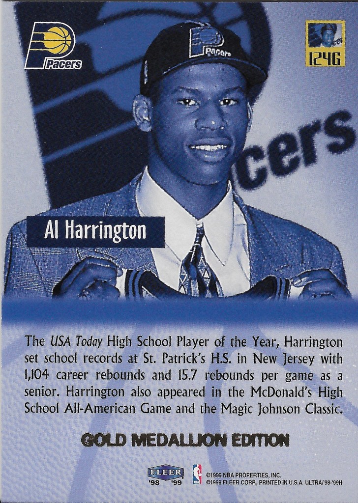 Speaking of eBay purchases, these are a few of my most recent. The Al Harrington is a 1998-99 Ultra Gold Medallion rookie. I already had the base rookie, which is a short print at 1:4 packs itself, but the rookie Gold Medallions are 1:35 and have a gold foil stamp on the back (looks black in this scan).