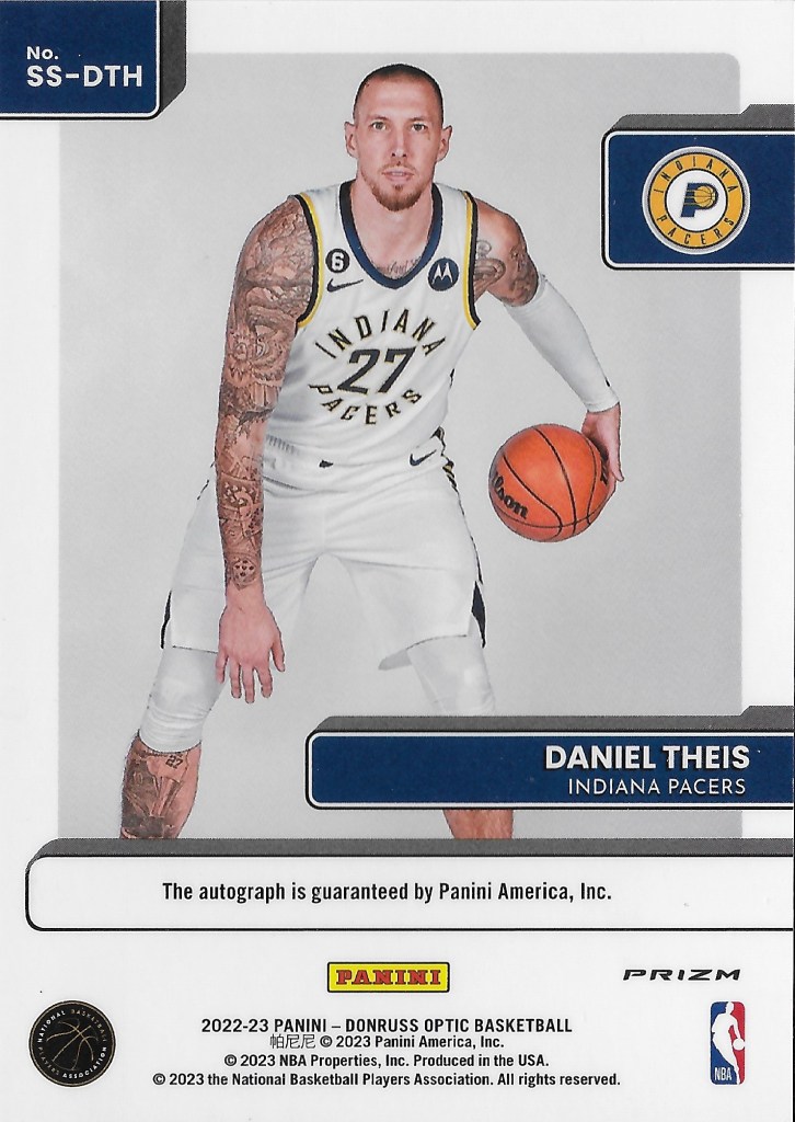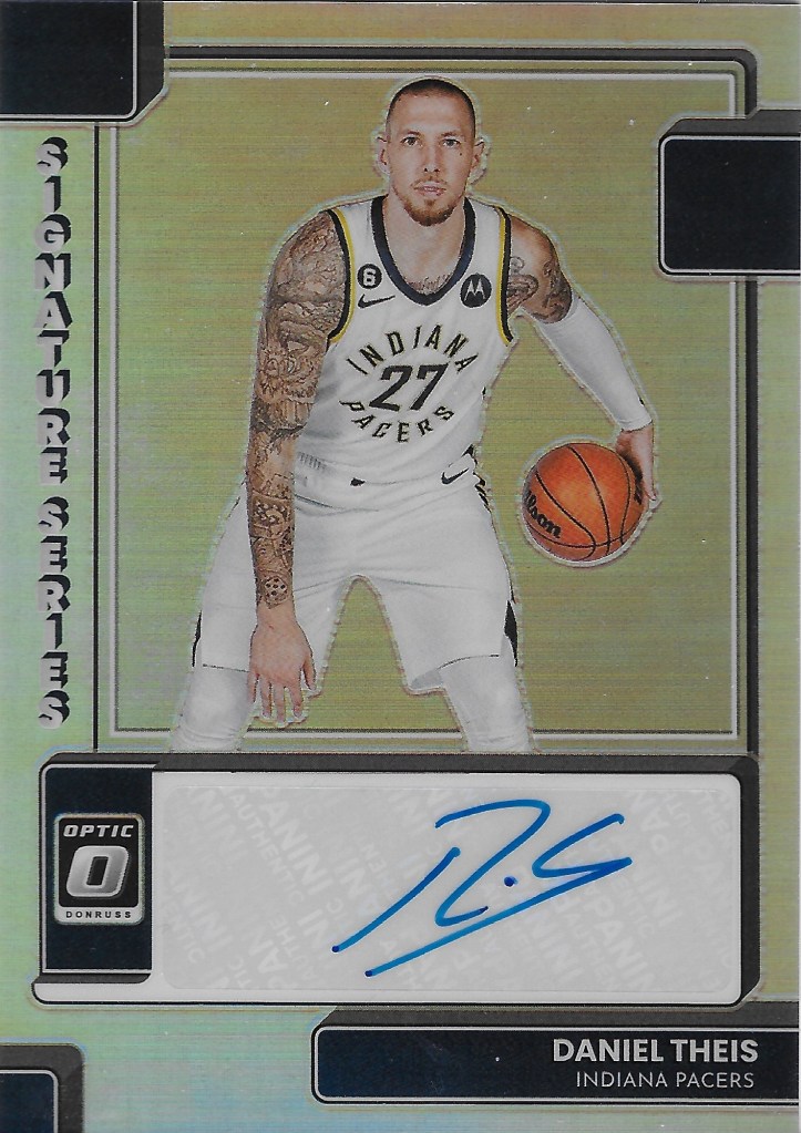 I continue to make incremental gains as I add to my Pacers autograph collection. One of my recent adds in this department is German national team star Daniel Theis. He’s featured as a Pacer in 2023-24 Optic, and I’ve been on the lookout for his Optic Holo autograph at the right price since the set was released. I finally landed on a copy recently and the Theis is now in it’s spot in the autograph binder.