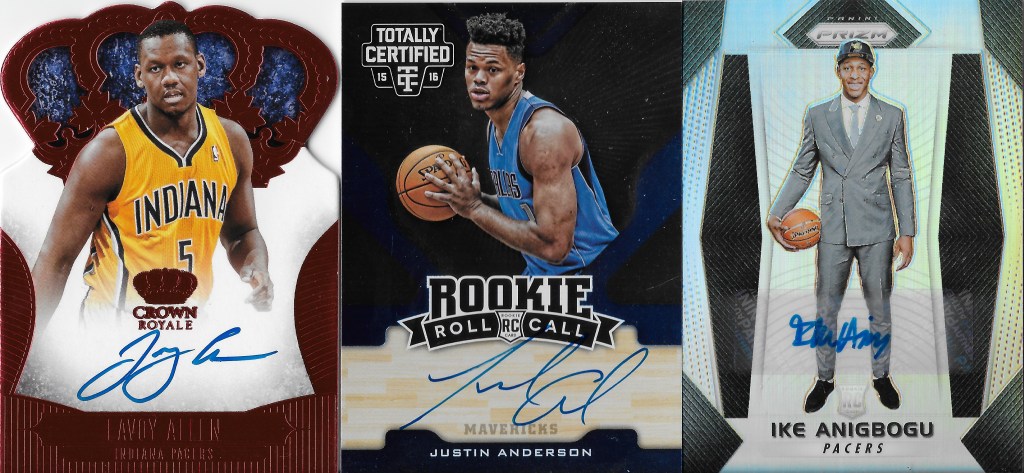 For the card, I added a 2015-16 Totally Certified Rookie Roll Call on-card autograph from Anderson’s rookie season with the Dallas Mavericks. While this is clearly not a Pacers card, it also don’t completely jump off the binder page as a Mavericks card.