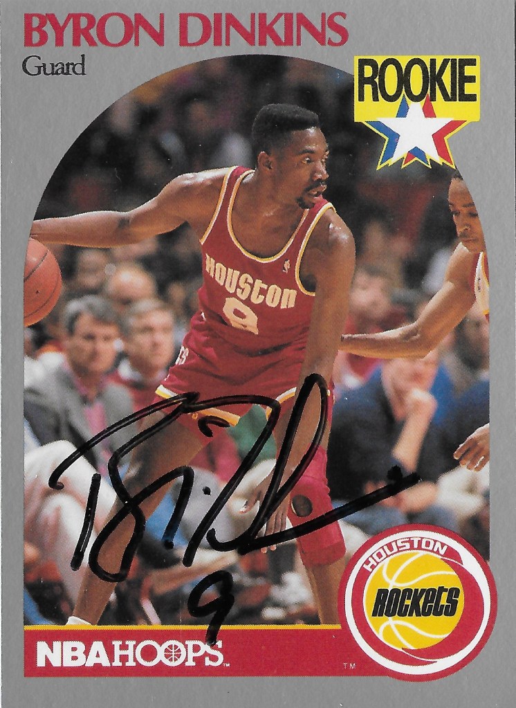 Point guard Byron Dinkins signed with the Rockets as an undrafted free agent for the 1989-90 season. He played in 45 games over two seasons with the Rockets, Spurs, and Pacers. He also played several years in the CBA and many more playing professionally overseas, including in Germany and Greece.