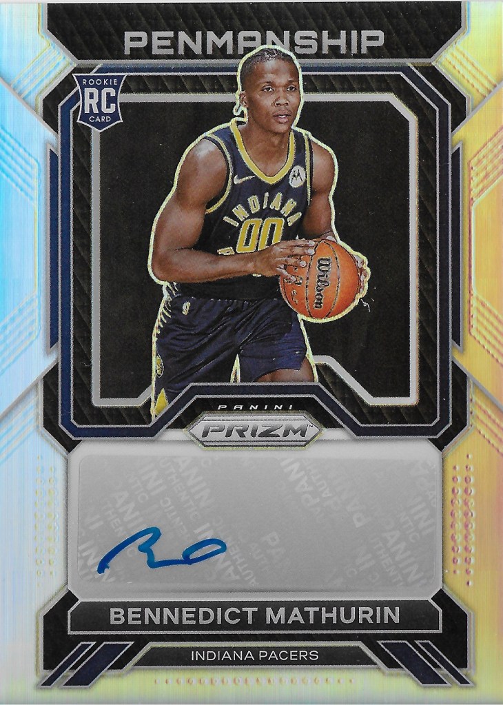 In the modern card era, choices for autograph cards for rookies, especially top 10 picks, are plentiful. However, Mathurin’s cards have been more pricy than I would like, and I held off on buying one for a pretty long time. When I walked into my local LCS and saw this Prizm rookie autograph sitting in the display case, I decided that was my sign to go ahead and add one. Maybe the method of purchase factors into my card hierarchy more than I thought. Adding in person versus online definitely weighs in.