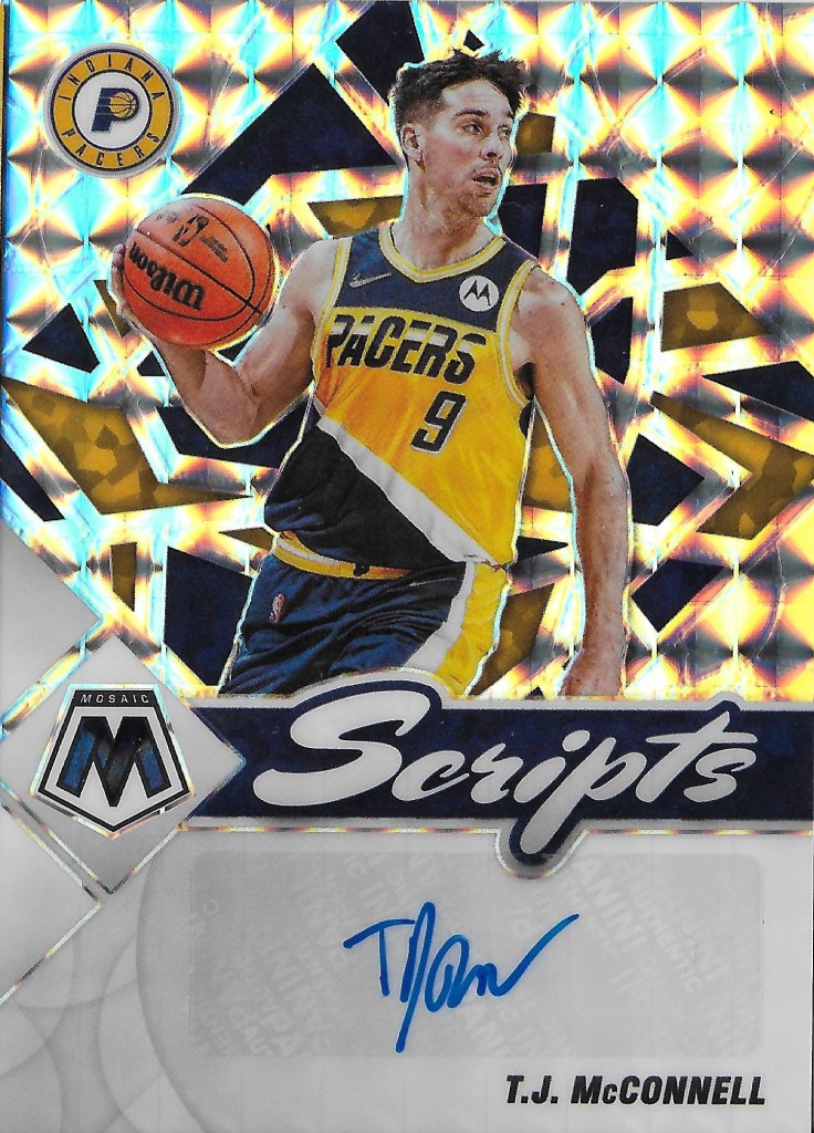 T.J. has many options for autograph cards in a Pacers uniform. I like this one with the City Edition jersey from 2021-22. The card is from 2021-22 Mosaic.