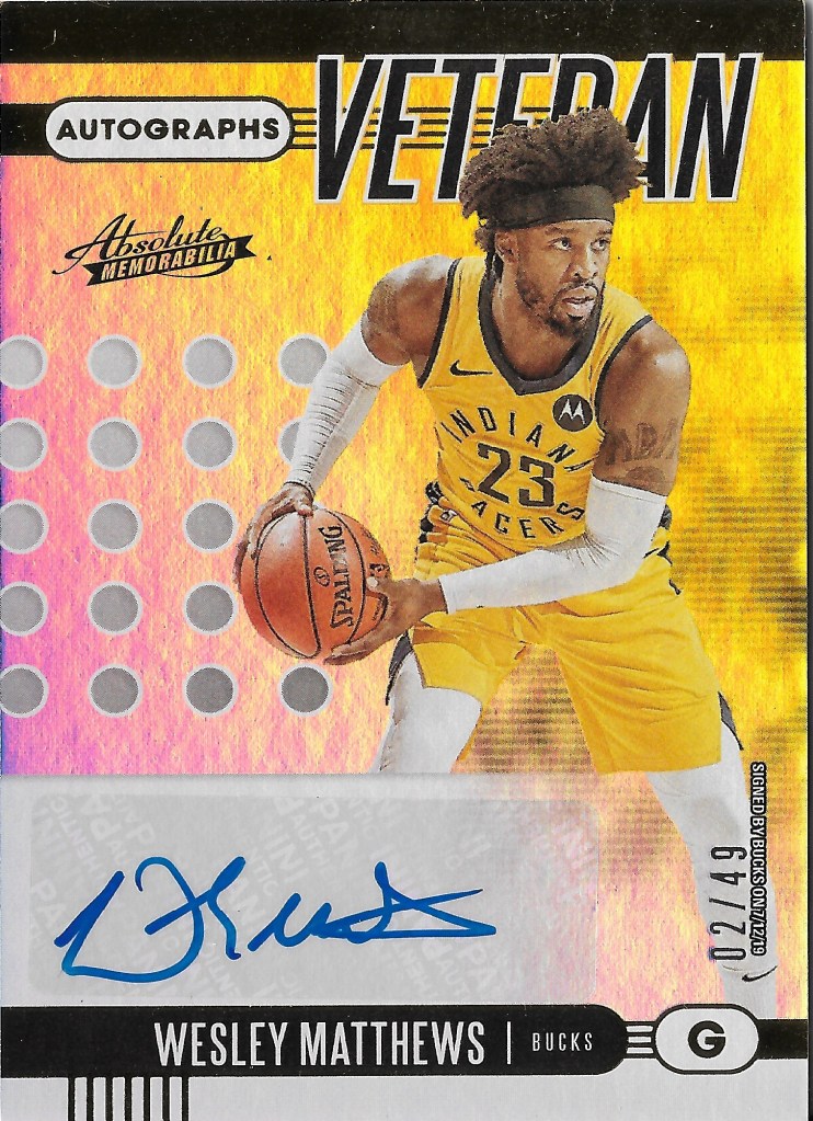 For card options, Matthews has an on-card autograph from Panini Impeccable which I would love to own, but it is likely too thick to be displayed in my autograph binder. I went with this 2019-20 Absolute card, which although is a sticker autograph and is technically labeled as a Bucks card, still has a nice design. This is the Gold version /49.